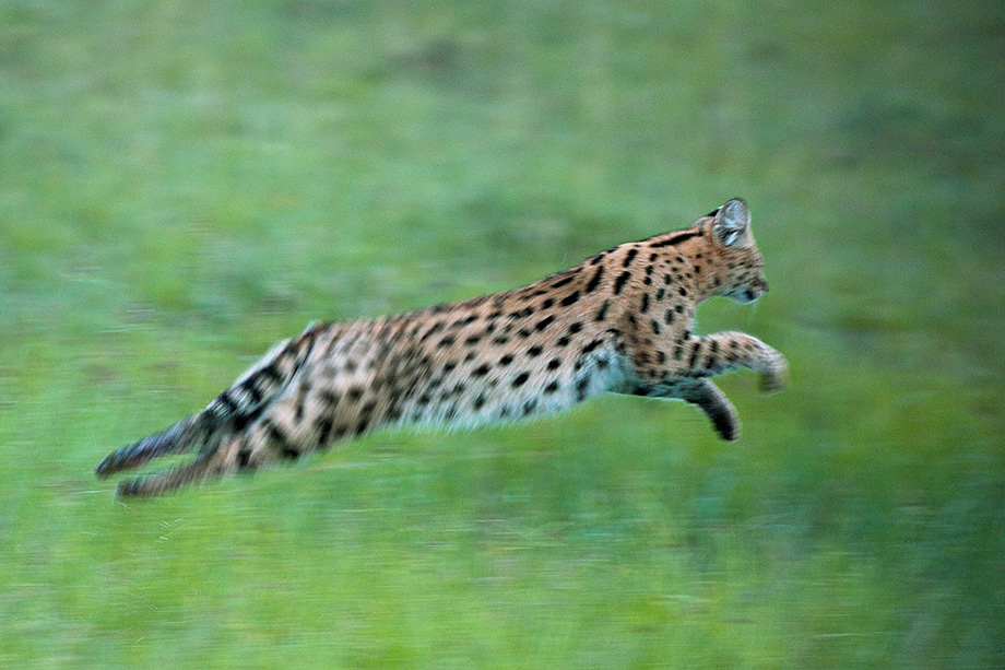 Servals are nocturnal and hunt mostly at night. We were lucky to catch this one in the late afternoon as it was heading out for the night. I previously posted another shot of this serval — more of a portrait. It gave us several different shot opportunities as it slowly got up from its hiding place in the grass when it realized we were onto him/her. It then took a few slow steps, then a few quicker ones, before leaping away. I captured a bit more motion blur than ideal in this photo, but there wasn’t much light and my shutter was pretty slow. Even so, I ended up liking the effect.