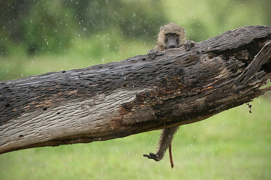 It had been raining pretty hard when we came across a troop of baboons in Laikipia, Kenya. One by one, they were crossing a small river using a fallen tree. I caught this guy as he was in the process of climbing down from the tree before getting to the other side.