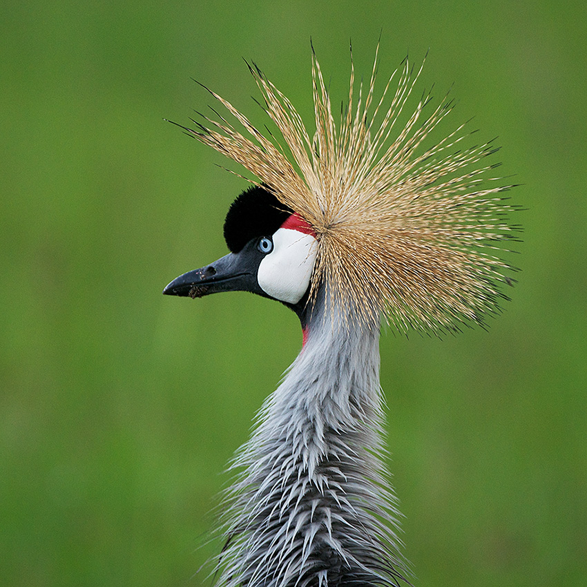 With their golden plumed heads, crowned cranes are clearly one of the more flamboyant birds in Africa. I’ve photographed them before in both Tanzania and Uganda but have never come across one like this Kenyan, bold enough to allow frame filling portraits. He even started to display a bit by puffing out his feathers and dancing around.
