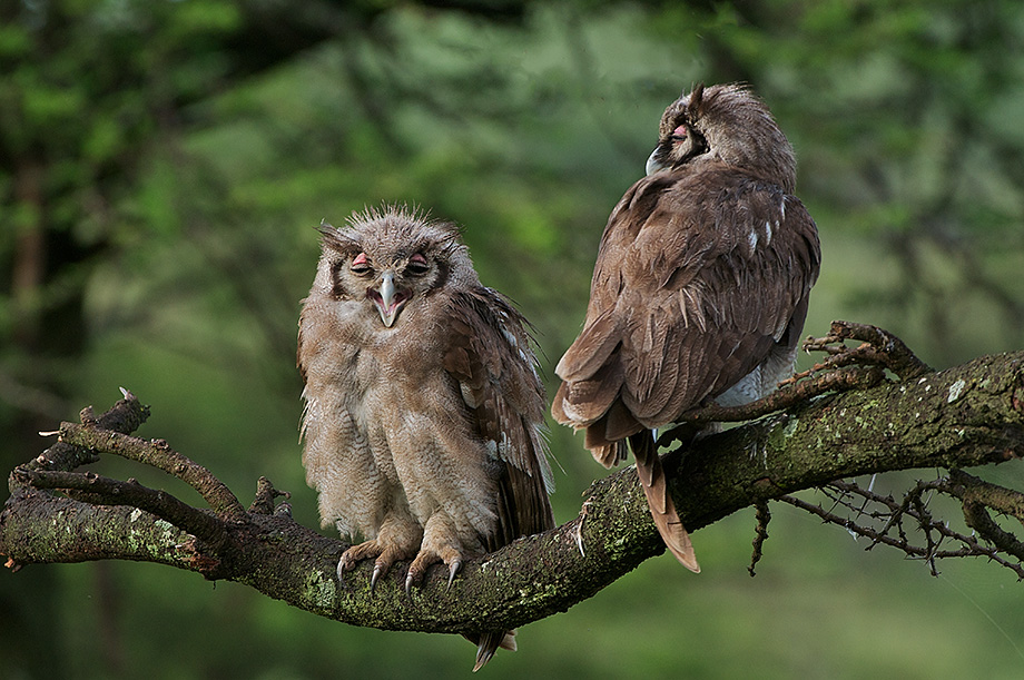 Verreaux’s eagle owls are the largest owls in Africa, and third largest owls in the world. When full grown, they can have a wingspan of nearly six and a half feet. These two youngsters weren’t even close to that size yet and were just beginning to acquire their adult plumage. I’ve seen eagle owls before in Tanzania, Uganda and Botswana and have always liked the bare eyelids, which look like pink eyeshadow. This feature will become more pronounced as they get older. This photo was taken on the last day of our Kenyan safari in the Olare Orok Conservancy just north of the Masai Mara.