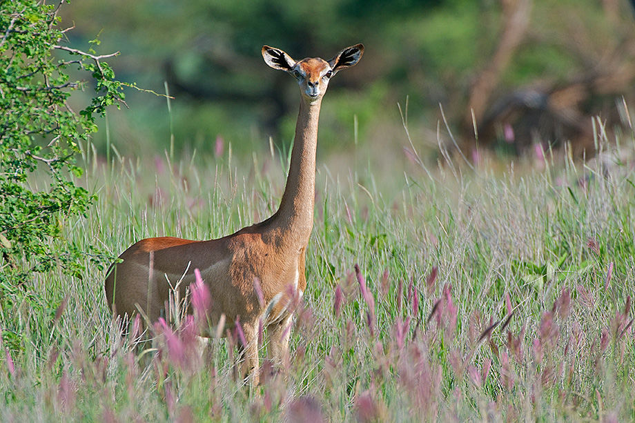 This long-necked antelope is called a gerenuk. The name comes from Somalia and means “giraffe-necked.” We only saw a couple of these guys. The males have a bit of a thicker neck, as well as horns. When feeding on taller branches, gerenuks will stand erect on their hind legs. I was hoping to capture a picture of this behavior but the best I could do was this female staring intently at us with her diminutive little head atop that spectacular neck.
