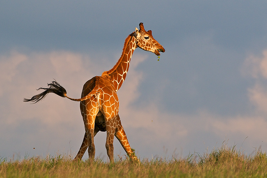We had nice end-of-the-day light when we came upon a few giraffes feeding off the ground. This is somewhat unusual behavior for giraffes, who much prefer to feed on trees while standing upright. When they splay their legs out to eat grass (or more commonly, drink water) they are in a very vulnerable position to lion attacks. For the most part, however, lions won’t mess with a giraffe due to the giraffe’s powerful kick. This species is called a reticulated giraffe, and it was photographed in the Lewa Wildlife Conservancy of Kenya.