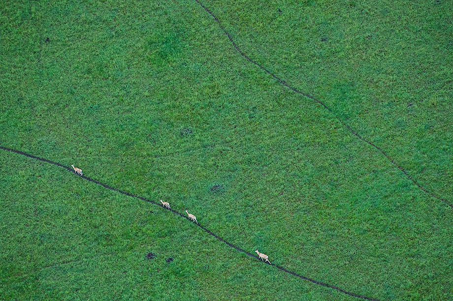 One morning in the Masai Mara, we decided to take a hot air balloon ride. The balloon launched just before sunrise and I was hoping for a sunny morning so that I could capture the long shadows of animals from above. Unfortunately, there was no sun. There also weren’t very many animals — at least not the large herds that I was hoping for. I was, however, able to capture a few shots like these impala traveling along one of the well worn migration paths that crisscross the savannah.