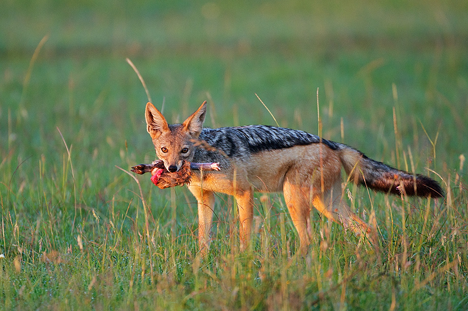 We had just left camp early one morning in the Masai Mara when we spotted this black-backed jackal with a little breakfast. That’s a gazelle leg the jackal has in its mouth. And that’s the great thing about being on safari in Africa — you never know what you’re going to get. One day it’s a pride of lions with cubs and the next it’s a jackal with a gazelle drumstick.