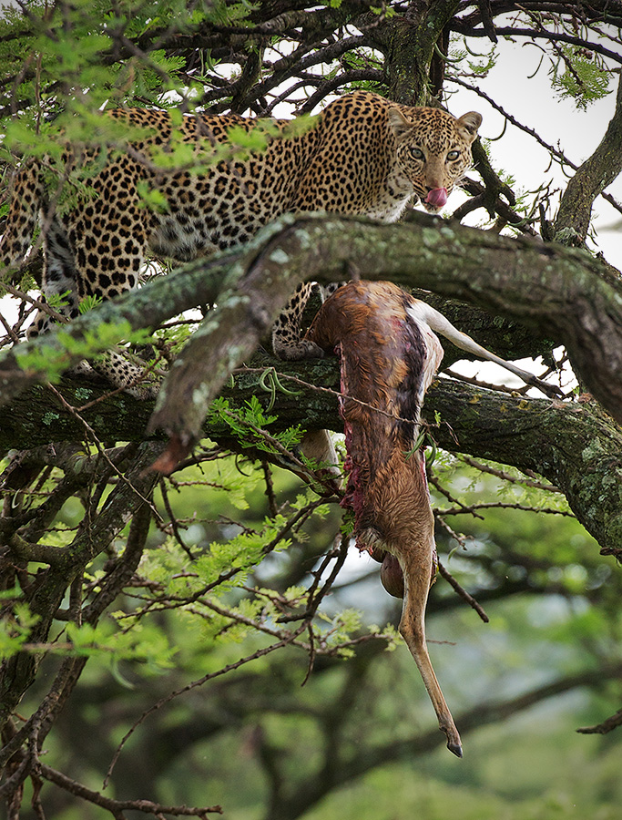 Leopards are very strong and are capable of dragging their prey up into trees — even large prey like this gazelle. They will do this to keep other carnivores like hyenas and baboons from stealing the kill. At first, we only saw the gazelle up in the tree while the leopard was nowhere to be found. We decided to leave for an hour or two and then circled back later to find her feeding.