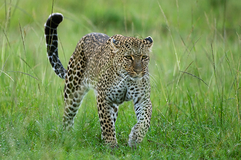 It wasn’t until the second to last night in Kenya that we had our first leopard sighting of the trip (although we would have two more on the final day). We were in the Masai Mara where you’re not allowed to drive off road and the leopard was quite a distance away. Several other vehicles were in the area, all trying to predict where she would make her move. We guessed right and were treated to a very close view as she passed about ten feet from our vehicle and then disappeared into the forest.