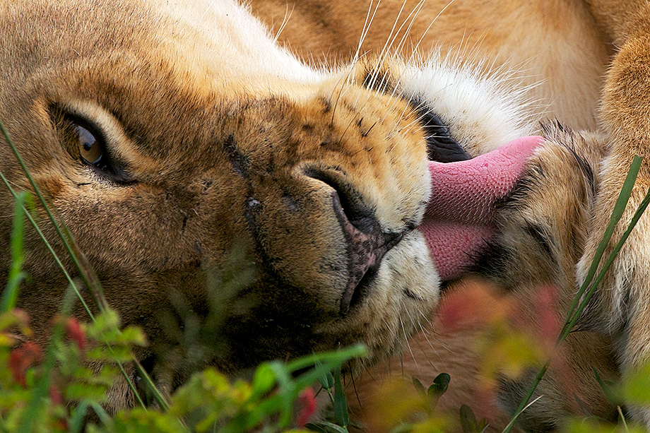 If you’ve ever been on an African safari, you know that getting close to lions isn’t a problem. I’m talking just feet away close. And for the most part, they won’t even acknowledge your presence (as long as you stay in your vehicle, of course). In this photo from the Masai Mara, I like the way that you can really see the texture in the lion’s tongue as she licks her paw.