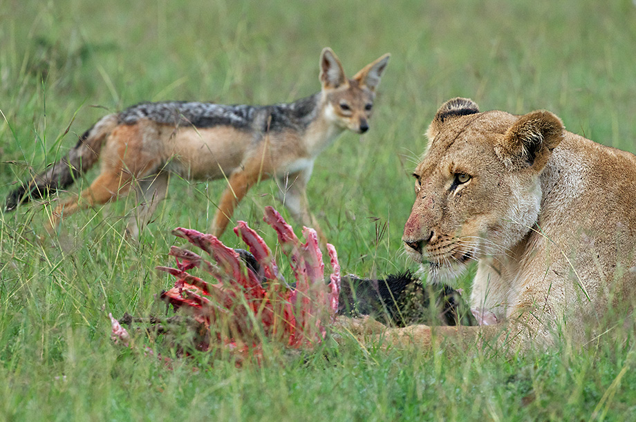 This lioness seemed to be deliberately messing with two jackals that wanted in on her wildebeest kill. She just wouldn’t give it up, eating every bit of fur and bone possible. The jackals tried their best to annoy her as they continued to circle, yapping away and even nipping at the lion’s tail. The lion was having none of it, refusing to be bothered. Eventually, the ordinarily patient jackals took off, probably convinced that there was nothing left to eat. As soon as they were gone, the lion got up and walked away, leaving what little was left of the kill to the vultures. I’m off for the next week and think that this might be the last post of the year. If so, happy holidays, and stay tuned for more from Kenya in a week or so.