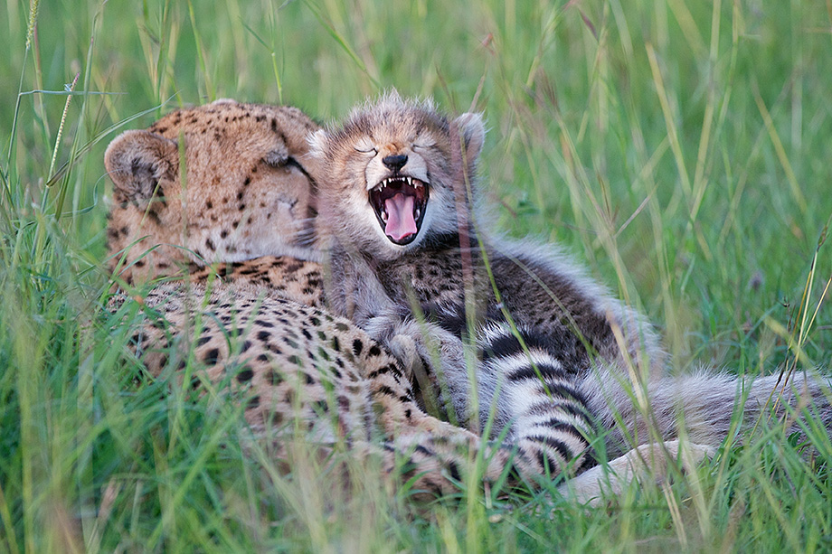 Again, I repeat, there aren’t many things in nature much cuter than a cheetah cub. Here’s another one, this time letting out a big yawn/yelp while nuzzling up to its mother. I took this photo just before the sun went down in the Masai Mara in Kenya.