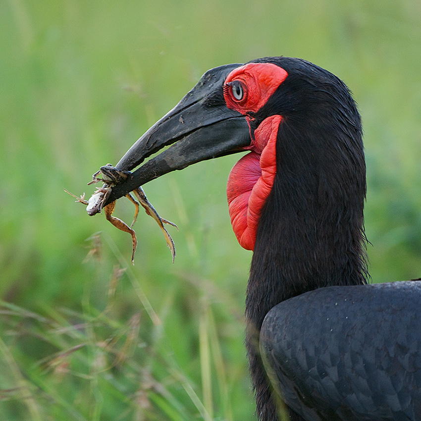 When I noticed that this ground hornbill had a frog in its beak, I immediately started snapping away, hoping to get a decent portrait or two. It wasn’t until I looked at the photos later that I realized the hornbill actually had two frogs in its beak. Oddly enough, it seemed to be saving the frogs for desert, placing them down every time it came across a beetle — then tossing the beetle in the air and down its gullet before picking the frogs back up and moving on. Most likely it was saving the frogs for chicks back at a nest.
