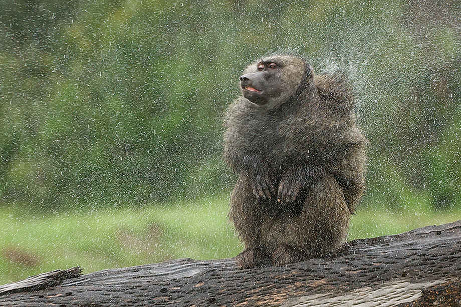 The short rains occur in Kenya from October through the beginning of December. To me, this is the perfect time to visit. As mentioned in a previous post, the landscape is lush with green vegetation, the skies are filled with dramatic clouds and the occasional rain showers provide interesting opportunities to photograph the wildlife. This is an olive baboon in the Laikipia area of the Ol Pejeta Conservancy. I spent about an hour photographing a large troop of these guys and captured quite a few similar water shake offs.