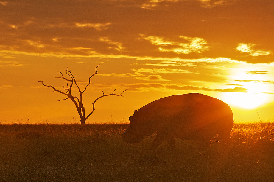 First thing in the morning is usually the best time to catch hippos out of the water. During the day, they need to stay out of the sun and in the water to keep their skin from burning. Our tent in the Masai Mara was set on the bank of a river just above a hippo pool and at night we could hear them snorting and gurgling and making all sorts of noises. We encountered this guy one of those early mornings just outside of our camp.