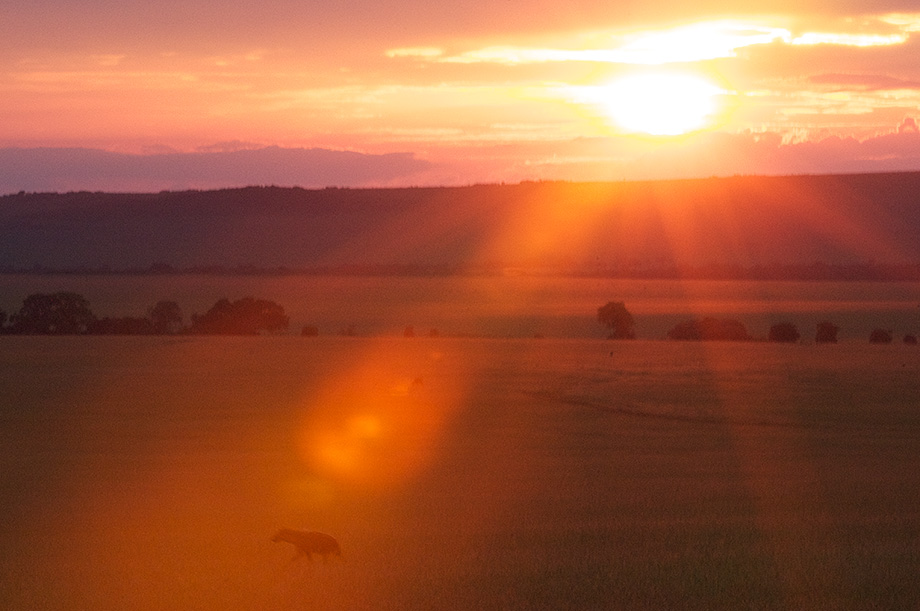 I used a small aperture on my long lens to get the rays of the sun to flare and shine a spotlight on this hyena as it headed out for a night of scavenging. Contrary to popular belief, however, hyenas aren’t just scavengers. We witnessed several as they unsuccessfully chased after newborn antelope calves. It seems that the spotted hyena will get its food by any means possible. This photo was taken on the last night of our safari in the Olare Orok concession of the Masai Mara reserve.