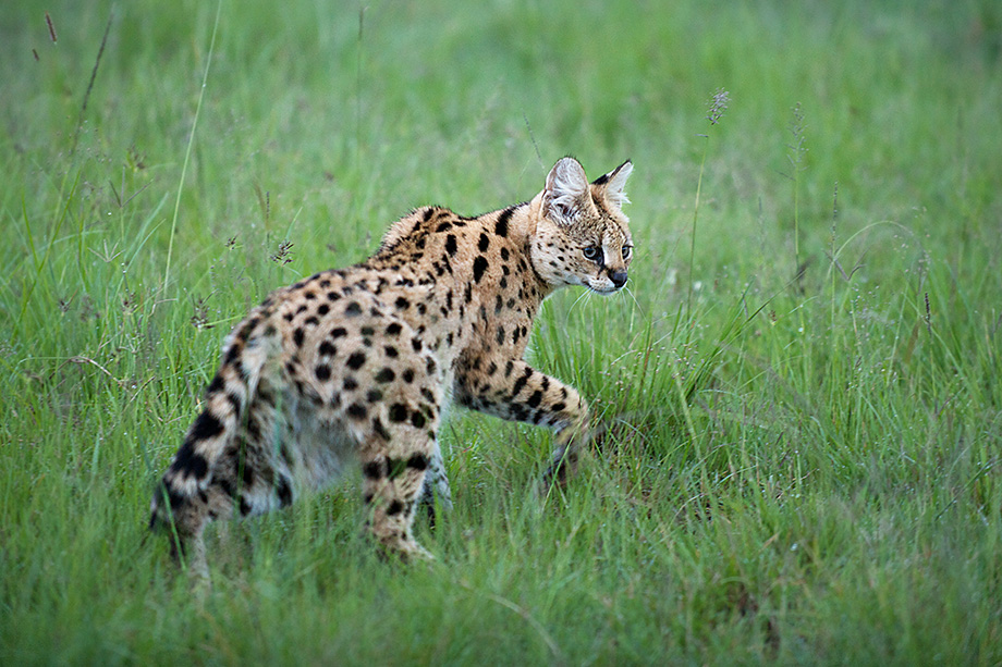 Spotting — and more importantly — being able to get decent pictures of a serval in the wild was definitely one of the highlights of my trip to Kenya. It was the second to last night of our two week safari and we were returning to camp after having finally photographed a leopard, completing the big five for this particular trip (leopard, lion, elephant, buffalo and rhino). We were feeling good about the leopard sighting and all of a sudden things got even better when I saw the serval crouched in the grass by the side of the road. She wasn’t doing a very good job of hiding in the short grass, like a child holding fingers in front of her face, thinking that we couldn’t see her. Realizing that we were on to her, she cautiously raised up before taking a few slow steps, then a few quicker ones, and then a full on sprint into the thicker grass. This shot was one of those first few slow steps. I also got nice shots of her leaping away. I was so excited because servals are rarely seen, and being nocturnal, when they are spotted, it’s usually at night. It was, however, getting pretty dark when I took this picture, but I was able to crank up the ISO and avoid using flash thanks to the last remaining light of the day. Servals are medium sized spotted and striped cats, with a smallish head to body ratio, long legs and large, close set ears.