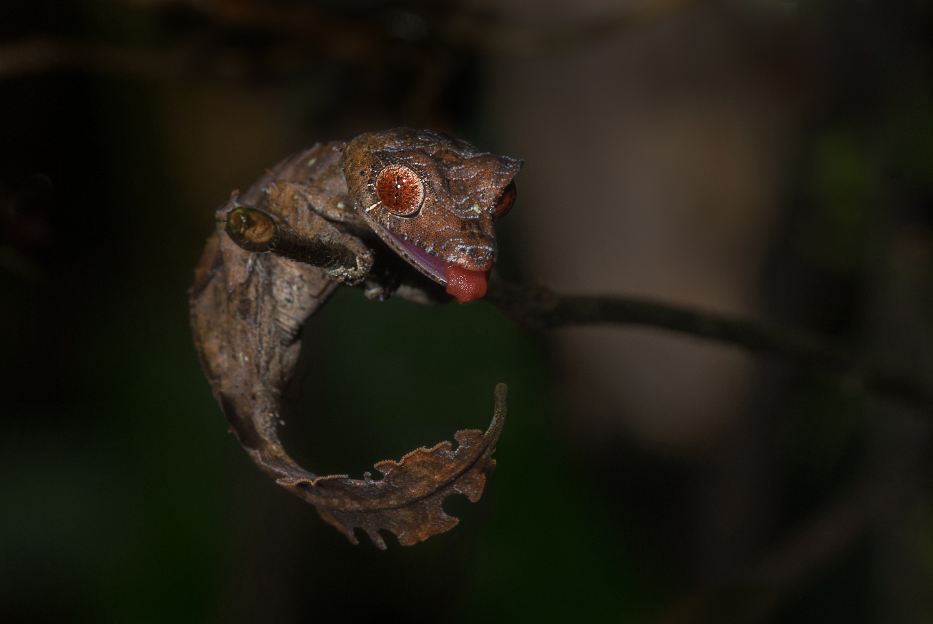 This is the fantastic leaf tailed gecko (Uroplatus phantasticus), also known as the satanic leaf tailed gecko. I kind of think the latter name is a bit more apropos. Of course, fantastic or satanic, the “leaf tailed” part of the name is quite evident in this photo. We met in Madagascar’s Ranomafana National Park late one evening.