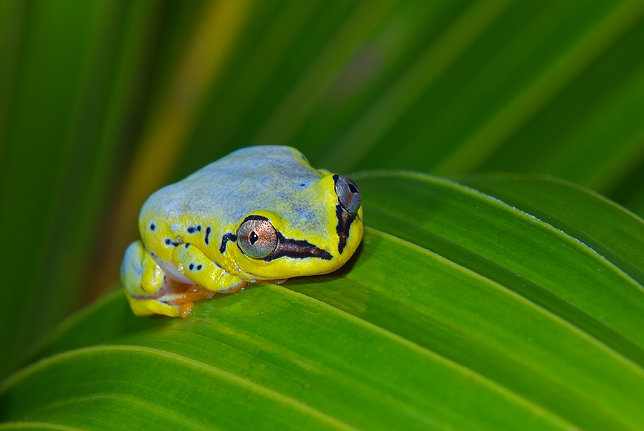 In honor of my frog loving little sister who’s birthday it is today, I had to search through my archives to find a suitable subject. This beauty is a Madagascar reed frog that I photographed in the town of Maroantsetra. I was stranded in the town due to bad weather and spent several days just walking around the grounds of the hotel I was staying at, looking for whatever animals I could find. When young, these frogs are completely yellow (see this link to a juvenile that I saw the next day) but when they mature, they get that nice light blue color on their backs. Happy birthday Mo.