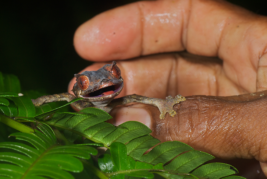 Sometimes you need a hand in there to get a sense of scale. This was a little leaf-tailed gecko that my guide found one night while we were out spotlighting in Ranomafana National Park in Madagascar. In my three weeks in the country, I saw both geckos and chameleons that were as small as an inch long, while others were over two feet.