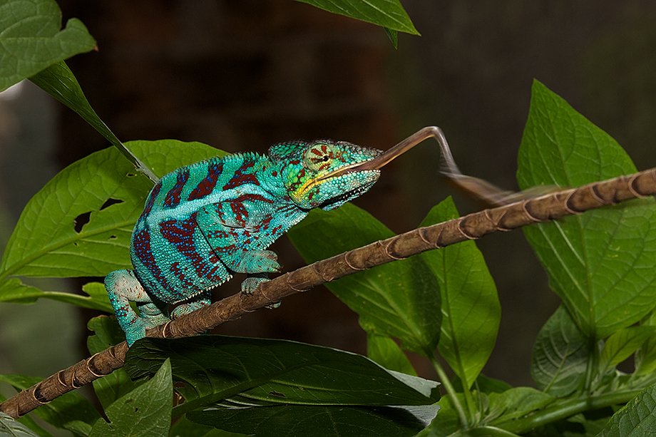 A chameleon’s tongue can be one and a half to two times its body length. The strike for prey happens so fast that it’s hard to get a picture (usually about 0.07 seconds). In my three weeks in Madagascar, I only had two opportunities to see and catch a tongue shot. This is one of them.
