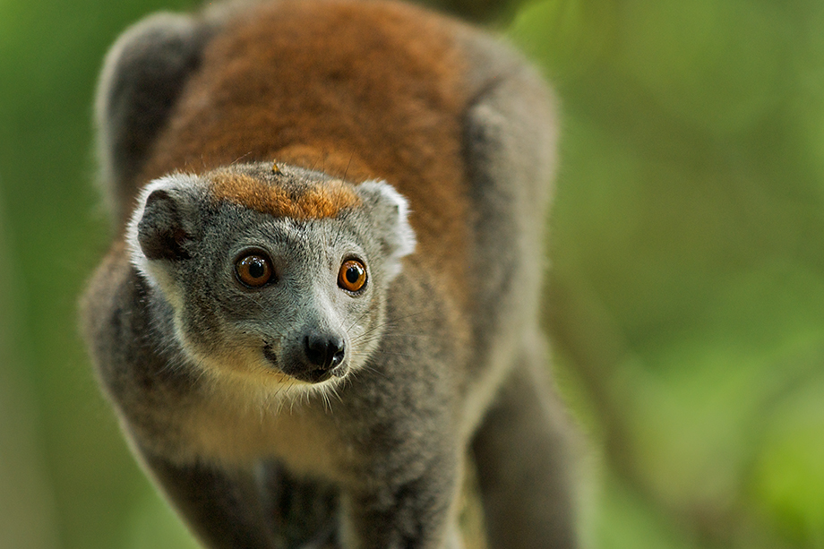 There are more than fifty different species of lemur in Madagascar, of all shapes, sizes and colors. About half of them are nocturnal. This is a crowned lemur — an average sized diurnal lemur. The name is an obvious reference to the reddish crown on the forehead. This individual is a female. Males have the exact opposite coloration (reddish body with a grey crown), a characteristic known as sexual dimorphism.