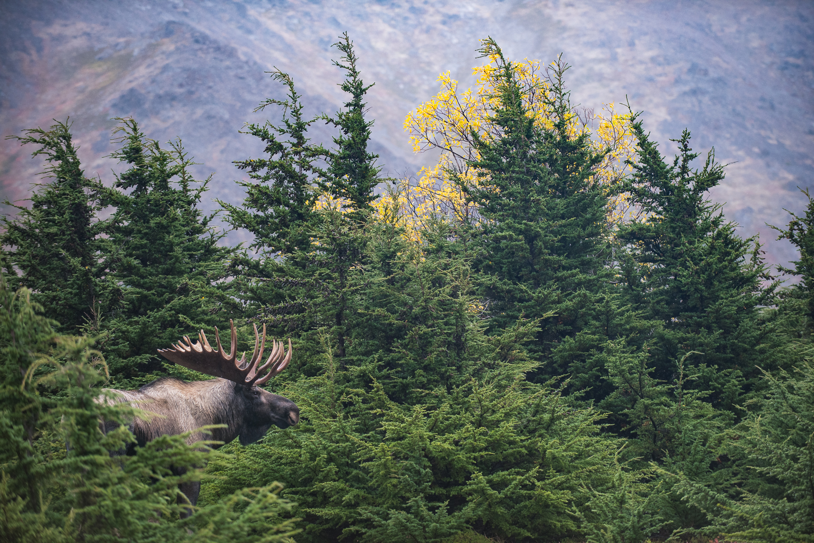 It’s moose rutting season again in Alaska. This is a shot I took back in September of 2017. Would love to get back and have even close to the experience I did when I ran into about five or so males (hard to tell as they kept disappearing and reappearing from the bushes) and a single female doing their yearly dance. Nikon D810 with Nikkor 70-200mm lens (at 86mm) ISO 800, f/4 at 1/1600th of a second.