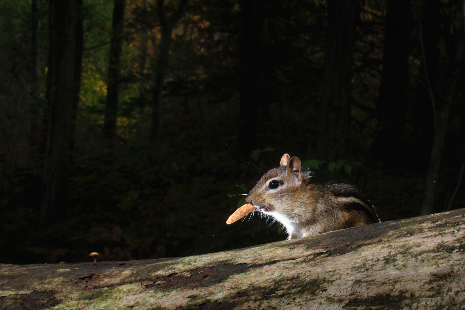 We called them helicopters when I was a kid. Whirlybirds were another common nickname, but they are actually called samaras, and they are most common with maple trees. Chipmunks — like this one that recently visited my backyard camera trap — collect them and store them for winter. They peel back the paper-y outer wings and eat the seed that sits inside. Nikon D3300 with Nikkor 18-55mm lens (at 29mm) ISO 400, f/14 at 1/250th of a second, Camtraptions camera housing and triggers, Nikon SB-900 flash units.