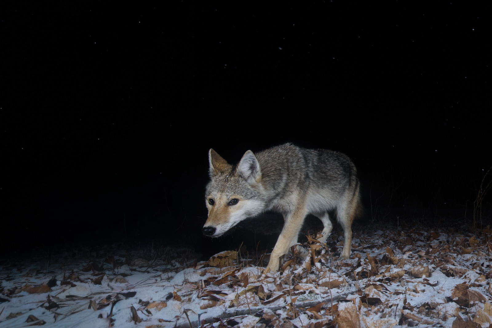 Last week I posted a coyote walking perpendicular to my camera trap. That’s what they usually do and I get the same side profile. But the other night I had one coming toward camera for a better angle. The coyotes found in Connecticut belong to the Eastern coyote subspecies. They are larger than their western cousins. Genetic studies show they’re a hybrid mix of western coyote, eastern wolf, and domestic dog, which explains their larger size, broader skulls, and more varied behavior. Nikon D810 with Nikkor 17-35mm lens (at 24mm) ISO 500, f/14 at 1/200th of a second, Cognisys camera box, trail monitor and two remote flash units.