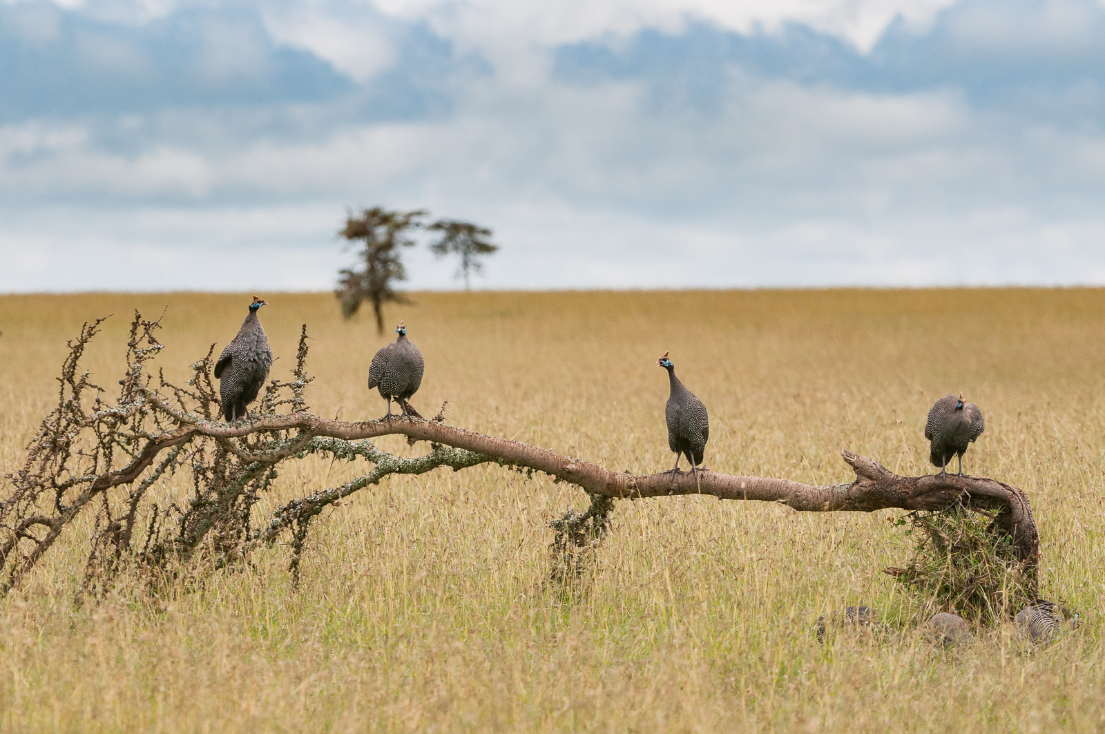 Four helmeted guineafowl get a better look out across the savanna from atop a fallen tree. Photographed in Laikipia, Kenya. Nikon D300 with Nikkor 200-400mm lens (at 280mm) f/5.6 at 1/1250th of a second.