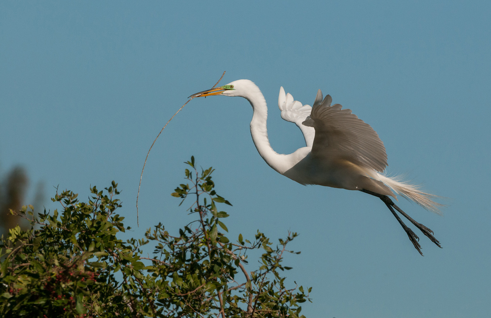 A great egret puts a finishing touch on a nest at the Venice Rookery in Florida. Nikon D300 with Nikkor 200-400mm lens (at 400mm) ISO 400, f/8 at 1/3200th of a second.