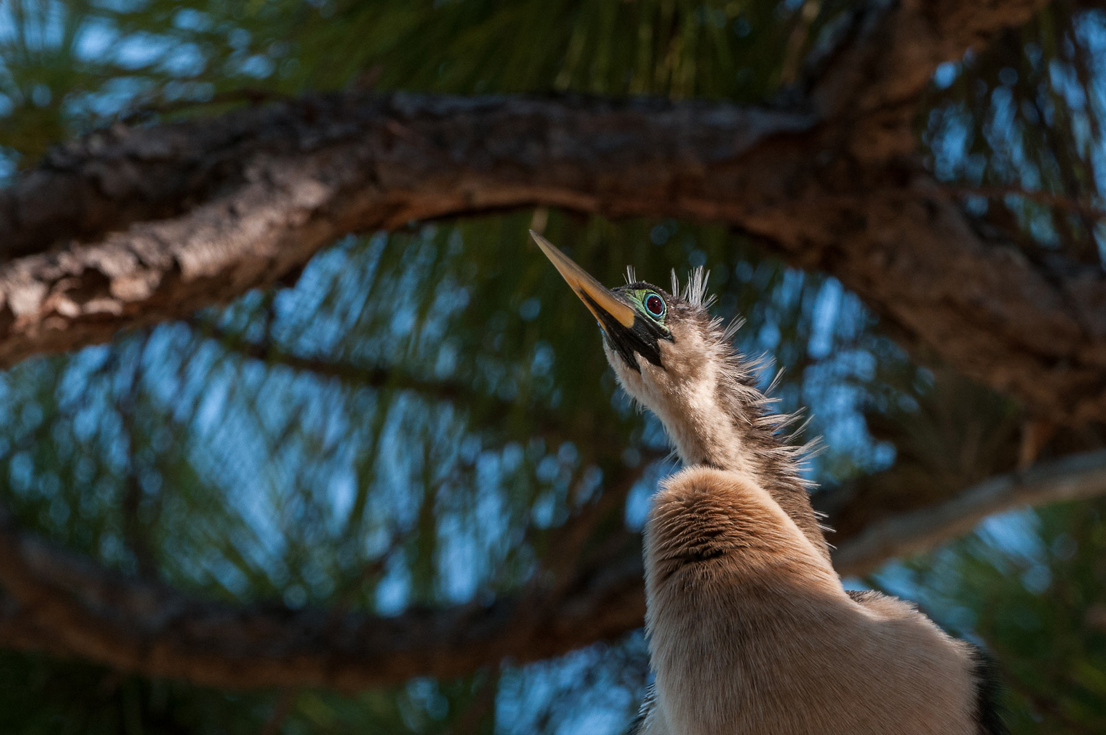 This anhinga landed on a branch just above me, making for an interesting angle. Almost wide angle looking, but was actually at 360mm. Photographed at the Venice Rookery in Florida. Nikon D300 with Nikkor 200-400mm lens (at 360mm) ISO 400, f/8 at 1/250th of a second.