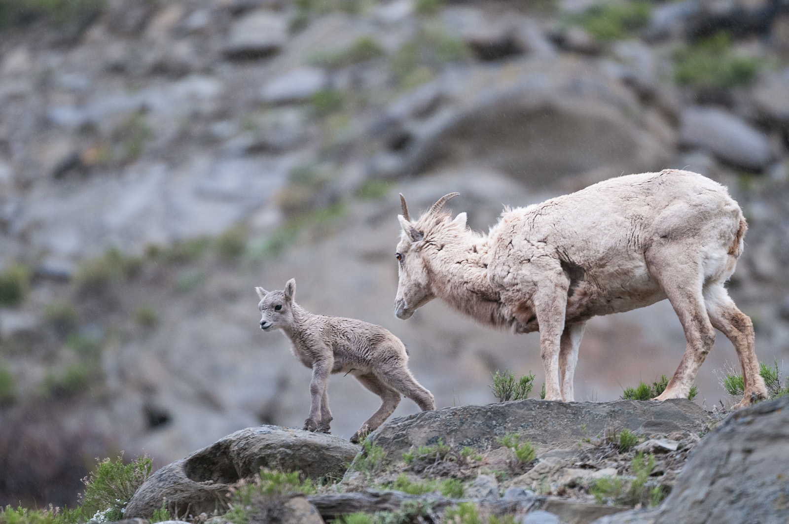 Late May/early June is a great time to see bighorn lambs in Yellowstone. Although sometimes they’re not quite as easy to spot as you might think. The newborns can be the same exact color as the surrounding landscape. But when you do spot them, they’re a lot of fun to watch as they jump all around the steep mountainsides. Nikon D300 with Nikkor 200-400mm lens (at 400mm) ISO 800, f/4 at 1/250th of a second.