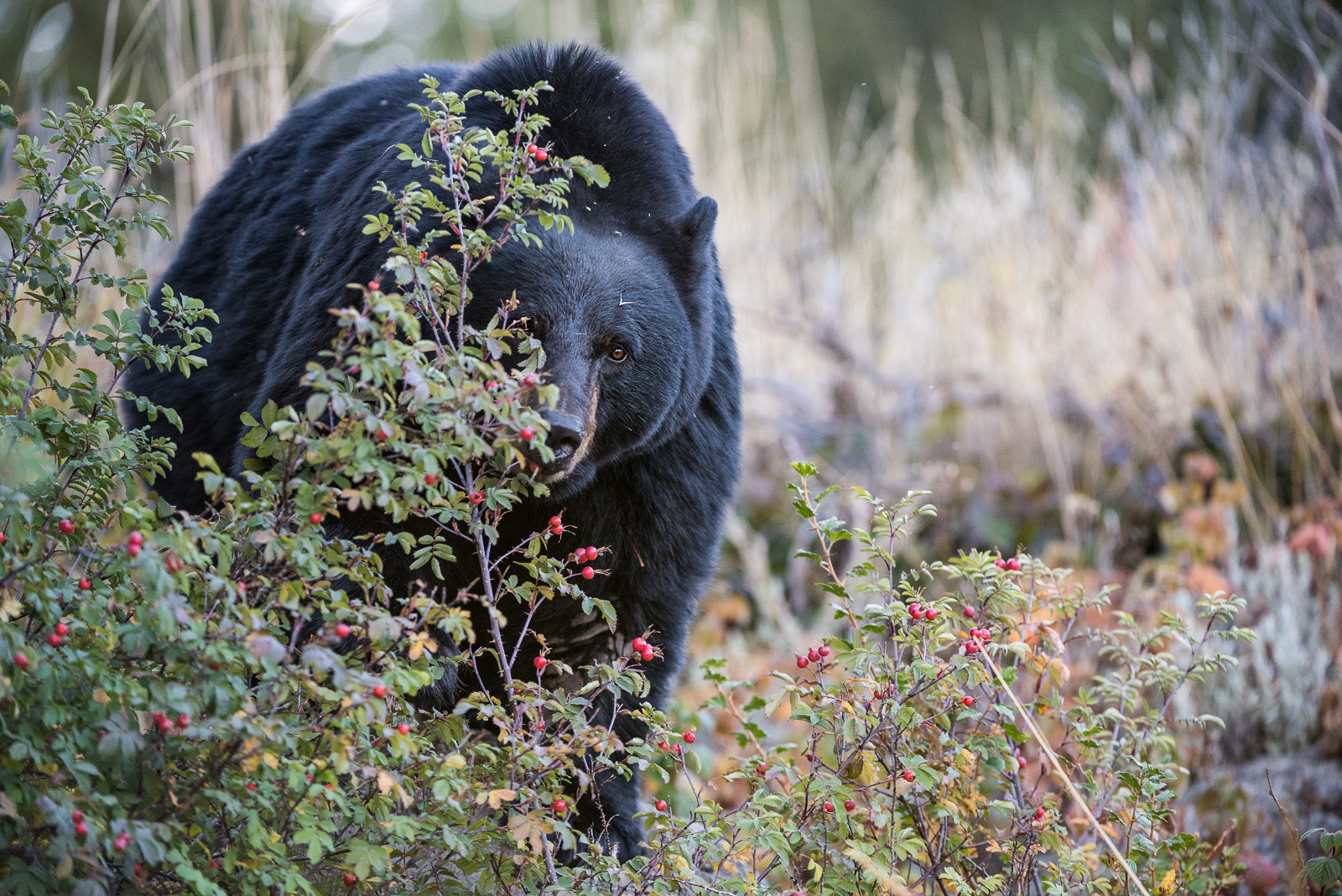 A rather large black bear fills up on berries, preparing for hibernation a few years back in Yellowstone National Park. The denning period for black bears in Yellowstone is roughly five months. Nikon D810 with Nikkor 200-400mm lens (at 260mm) ISO 2000, f/4 at 1/400th of a second.