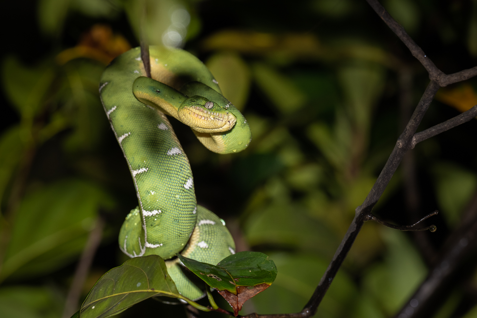 The emerald tree boa is a non-venomous snake native to the rainforests of South America, especially the Amazon Basin. With vivid green scales marked by jagged white stripes, it blends perfectly into the canopy where it spends most of its life coiled on branches. Despite its relaxed appearance, it’s an ambush predator, striking with lightning speed to snatch birds, lizards, and small mammals. Unlike many snakes, the emerald tree boa gives birth to live young—miniature versions of itself that start out orange or red before turning green as they mature. This boa was photographed in the upper Amazon basin of Peru. Nikon D500 with Nikkor 500mm PF lens, ISO 800, f/9 at 1/80th of a second, Godox flash.