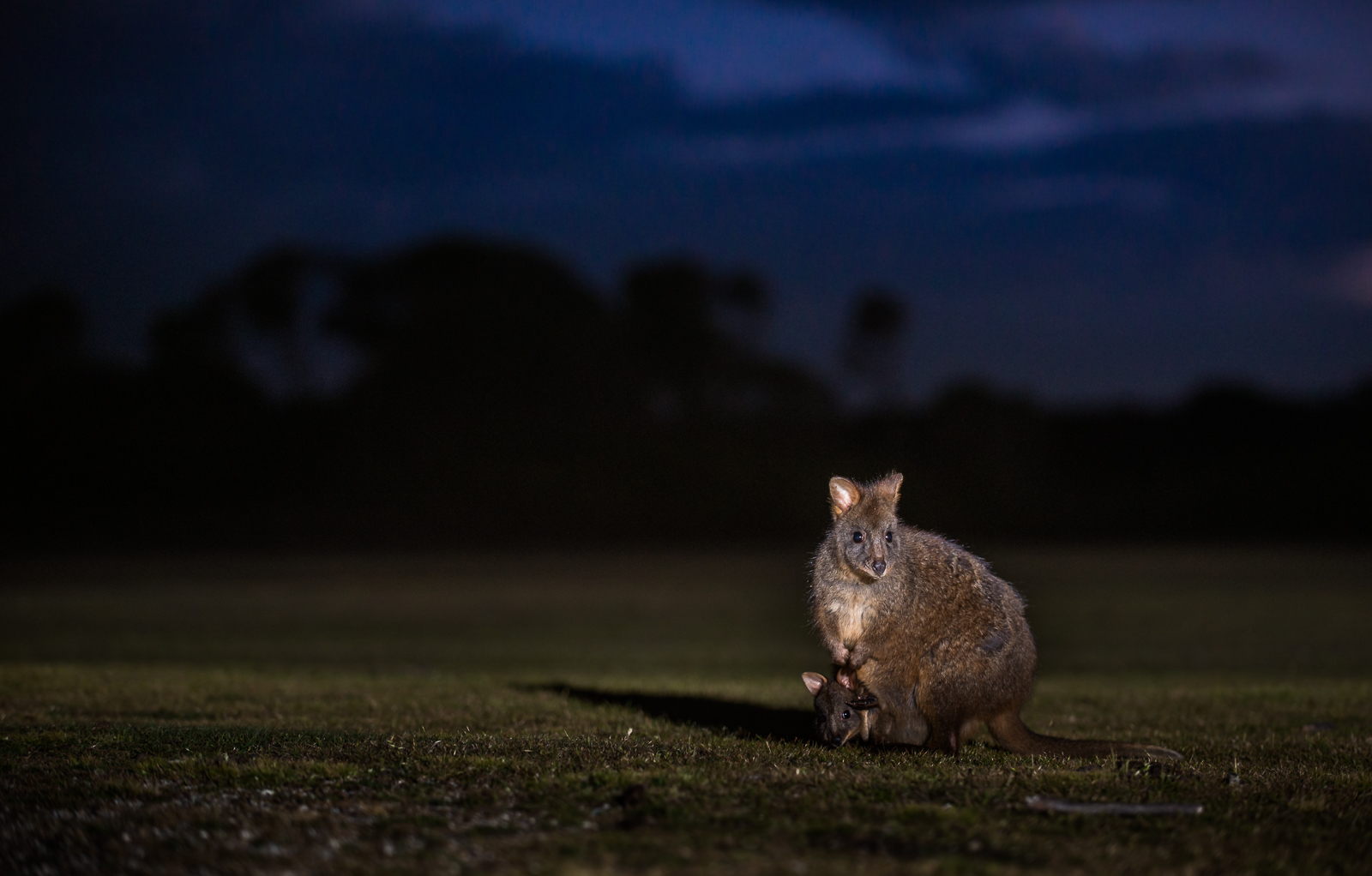 For this night shot of a Tasmanian pademelon and her joey, I was able to use a slow shutter speed to record color in the sky, while using an off camera flash to illuminate the pademelons. Pademelons are funny little macropods, smaller than wallabies and more round in shape. These two were in Narawntapu National Park on the northern coast of Tasmania. Nikon D800 with Nikkor 70-200mm lens (at 120mm) ISO 1600, f/2.8 at half a second