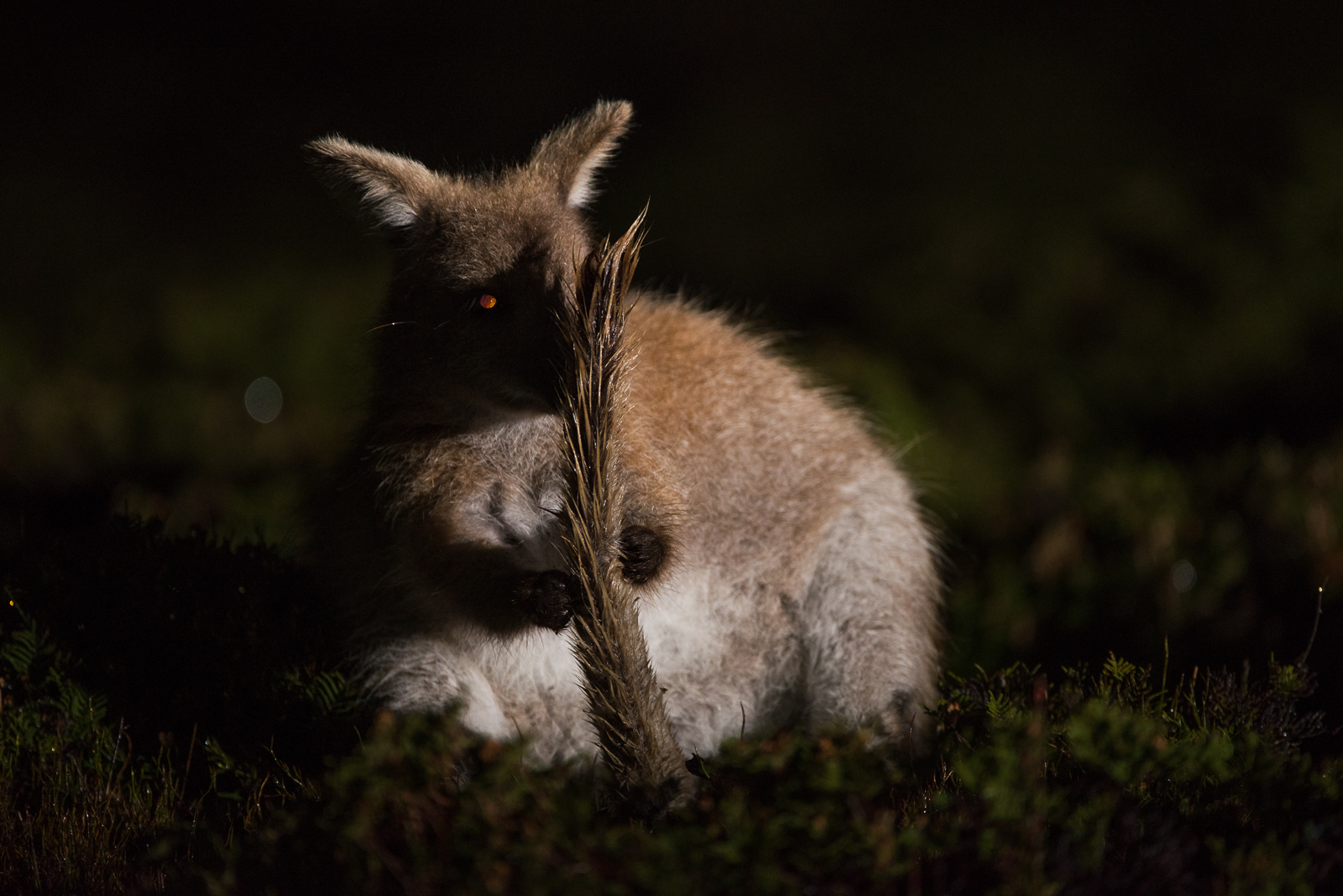 Ordinarily, I try to do my best to avoid eyeshine when photographing animals at night. The best way to do this is to get the flash off the camera — preferably way off. But sometimes, even that doesn’t help if my positioning and distance to the subject isn’t quite right. In this case, the tripod mounted flash wasn’t far enough away from me to avoid the orange glow of the distant wallaby’s eye. I feel that in this photo, however, it ended up being a happy accident. The eyeshine adds life (and a bit of devilishness) to the wallaby as it casts a shadow across its face while cleaning, and seemingly hiding behind its tail. Nikon D810 with Nikkor 200-400mm lens (at 400mm) ISO 800, f/4 at 1/200th of a second, Nikon SB-900 flash