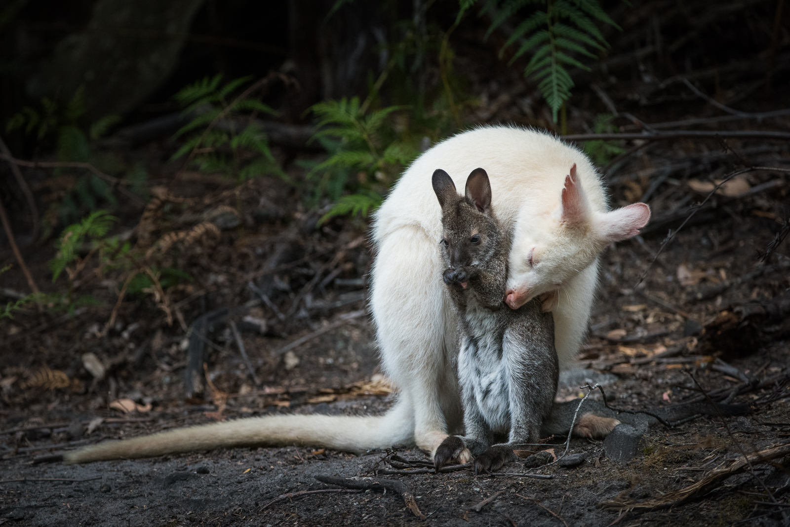Here’s another look at the white wallaby with brown joey that I got to know on Bruny Island in Tasmania. In this shot, the joey had just crawled out of the mother’s pouch. You can see that the joey does have quite a bit of white coloration on the stomach, no doubt inherited from mom. I took this photo about fifty yards from the accommodation I was staying at (Inala Cottage). I was able to spend a lot of time with the wallabies so they were quite comfortable with my presence and I was able to get a few intimate shots like this one. Nikon D810 with Nikkor 200-400mm lens (at 330mm) ISO 1600, f/5.6 at 1/640th of a second