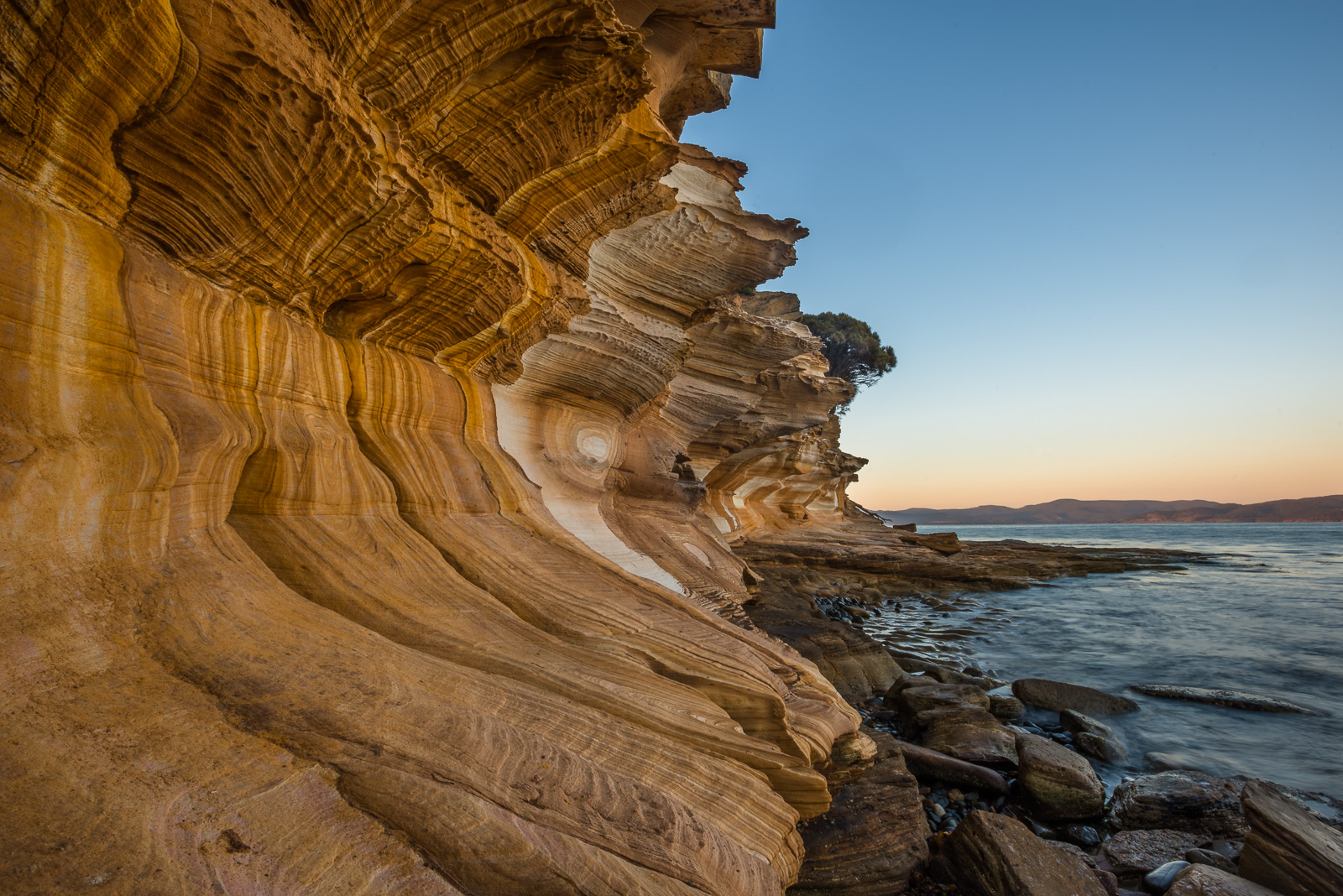 These two photos are from Maria Island in Tasmania, Australia. The patters in the rock were caused by groundwater which seeped down through the sandstone thousands of years ago and left behind iron oxides which stained the rock. Top photo — Nikon D800 with Nikkor 17-35mm lens (at 17mm) ISO 100, f/18 at 1/4th, 1/15th, 1/8th, 1/2 and 1 seconds