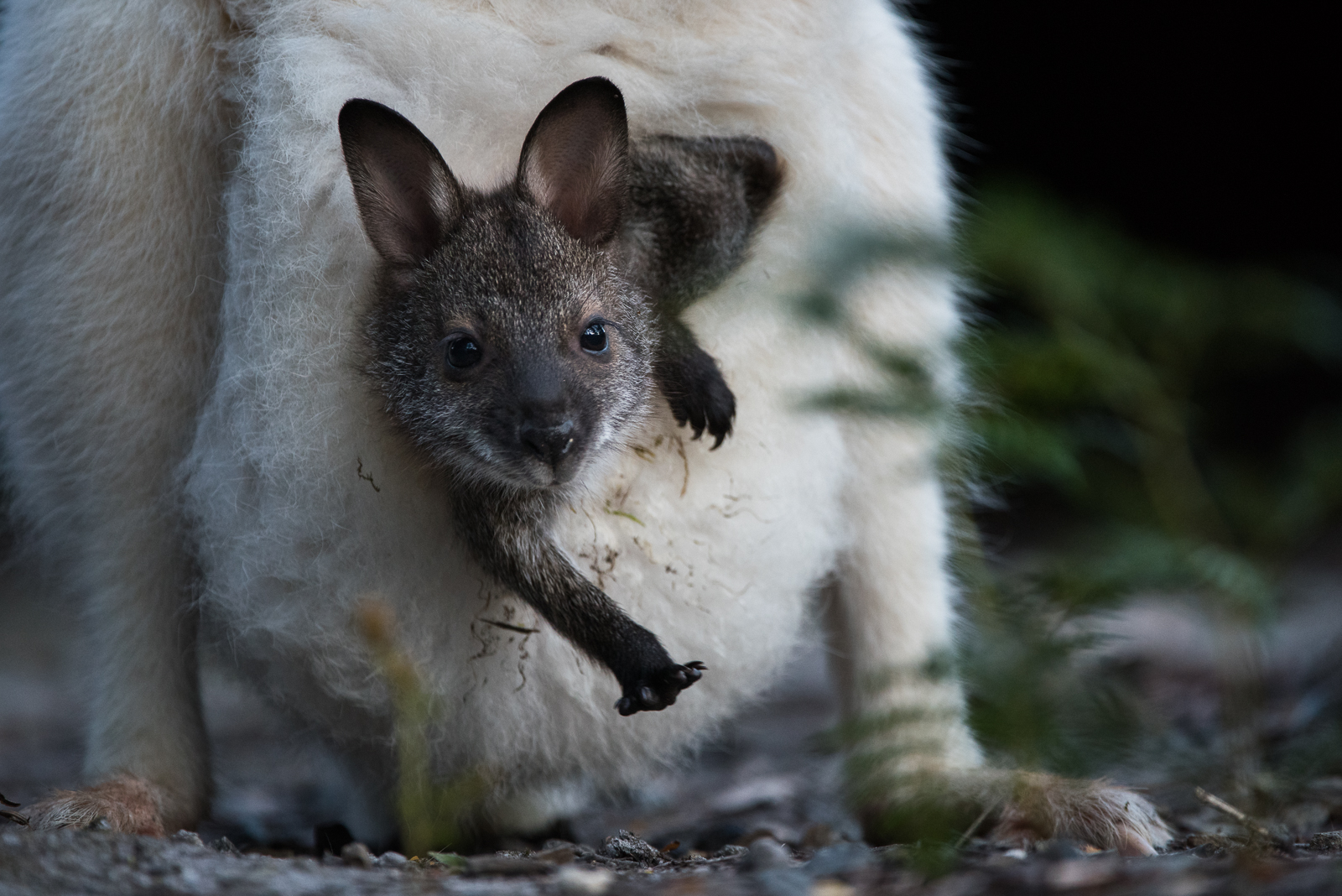 Here’s another photo from a Tasmanian island. This time it’s Bruny Island and the subject is a Bennett’s wallaby joey in its mother’s pouch. The joey is the normal coloration of Bennett’s wallaby whereas the mother is a rare white morph. I saw a handful of these white wallabies while on Bruny Island, always mixed in with the brown. Nikon D810 with Nikkor 200-400mm lens (at 400mm) ISO 1600, f/4 at 1/200th of a second