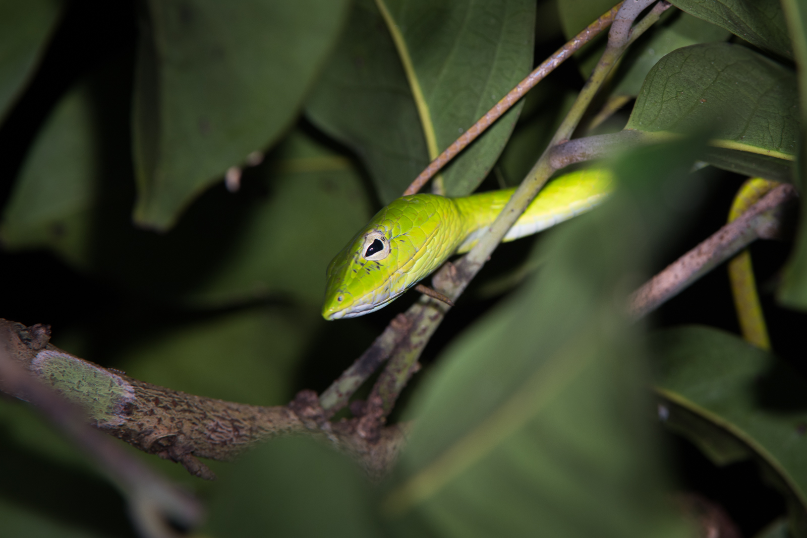 This sinister looking guy was creeping around in a tree near my tent in Kaeng Krachan National Park in Thailand. These green vine snakes are fairly common — and from what I’m told, only mildly venomous and not a significant threat to humans. I thought he was pretty cool looking with that arrowhead shaped pupil surrounded by white.