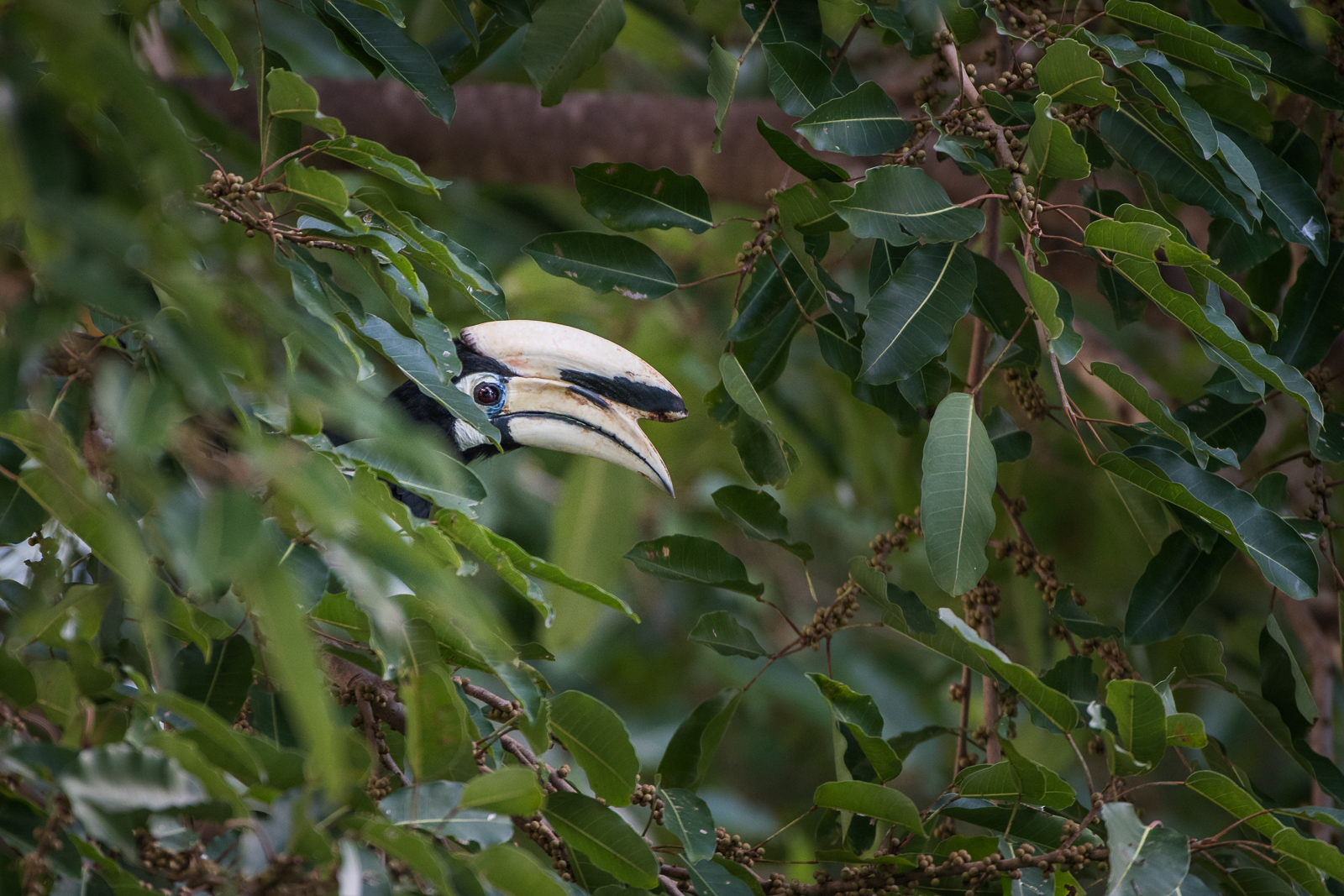 This is the Oriental pied hornbill. These guys were definitely more common than the great hornbill that I posted last week. Still, it was exciting to see them the number of times that I did. I captured several in-flight photos, but I kind of liked this simple portrait of the distinctive bill peaking through the foliage. Unlike the great hornbills that were almost always high in the canopy, the Oriental pied hornbills would occasionally make an appearance a bit lower to the ground, depending upon where the trees were fruiting.