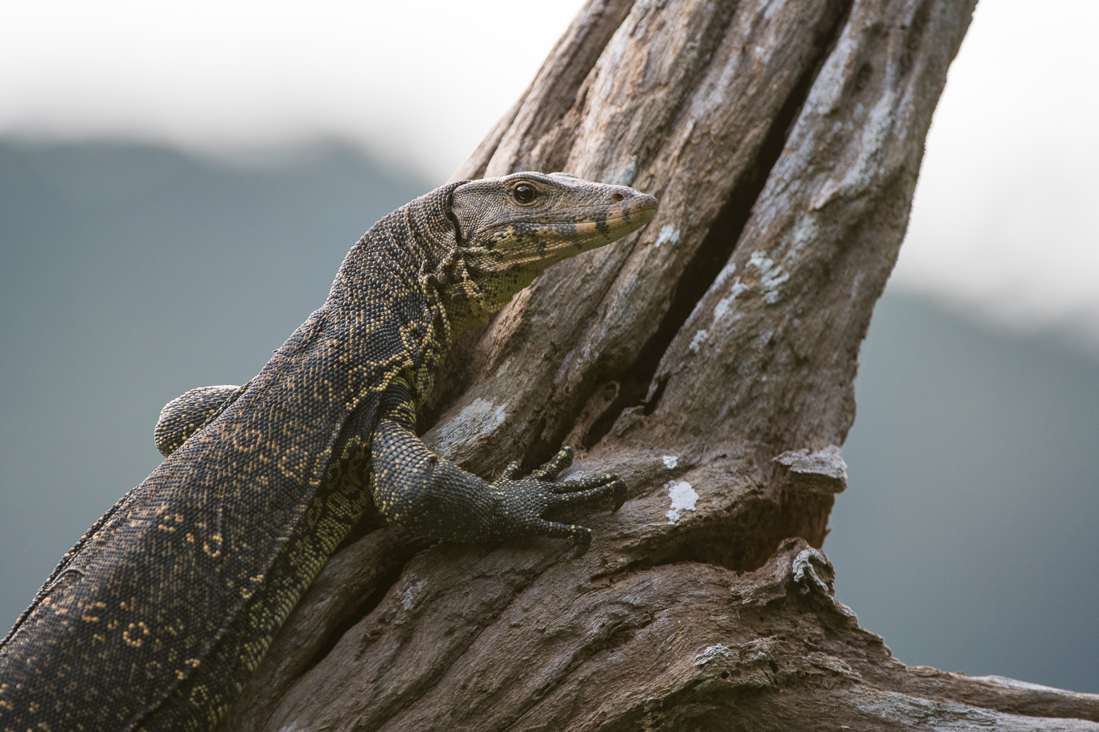 There are seventy-nine different species of monitor lizard on the planet, ranging in size from just about 8 inches, to over 10 feet in length. The largest and most famous monitor is the Komodo dragon. In the areas of Thailand that I visited, water monitors were fairly common. Tree monitors, however, were not and I was lucky to get a great look at this guy in the Khlong Seang Wildlife Sanctuary. He was big — not quite Komodo big — but maybe five feet from head to tail.