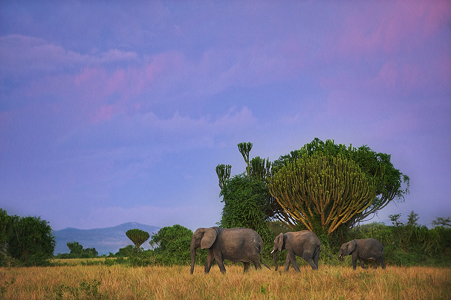I posted a similar photo a few years ago, but was recently going through my files and I was able to get a cleaner image of these three African elephants in Queen Elizabeth National Park in Uganda. The sun had been down for a while when I took this shot in the last possible light of the day. In the background you can see the euphorbia candelabrum trees that are typical of the Ugandan savannah.
