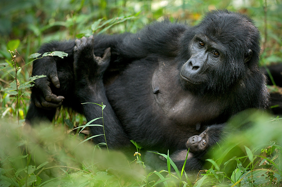 There were three baby gorillas in the troop of twenty three that we saw in the Ugandan jungle. The two other babies were running around, swinging from vines and playing when this one settled into its mother’s arms to take a nap.