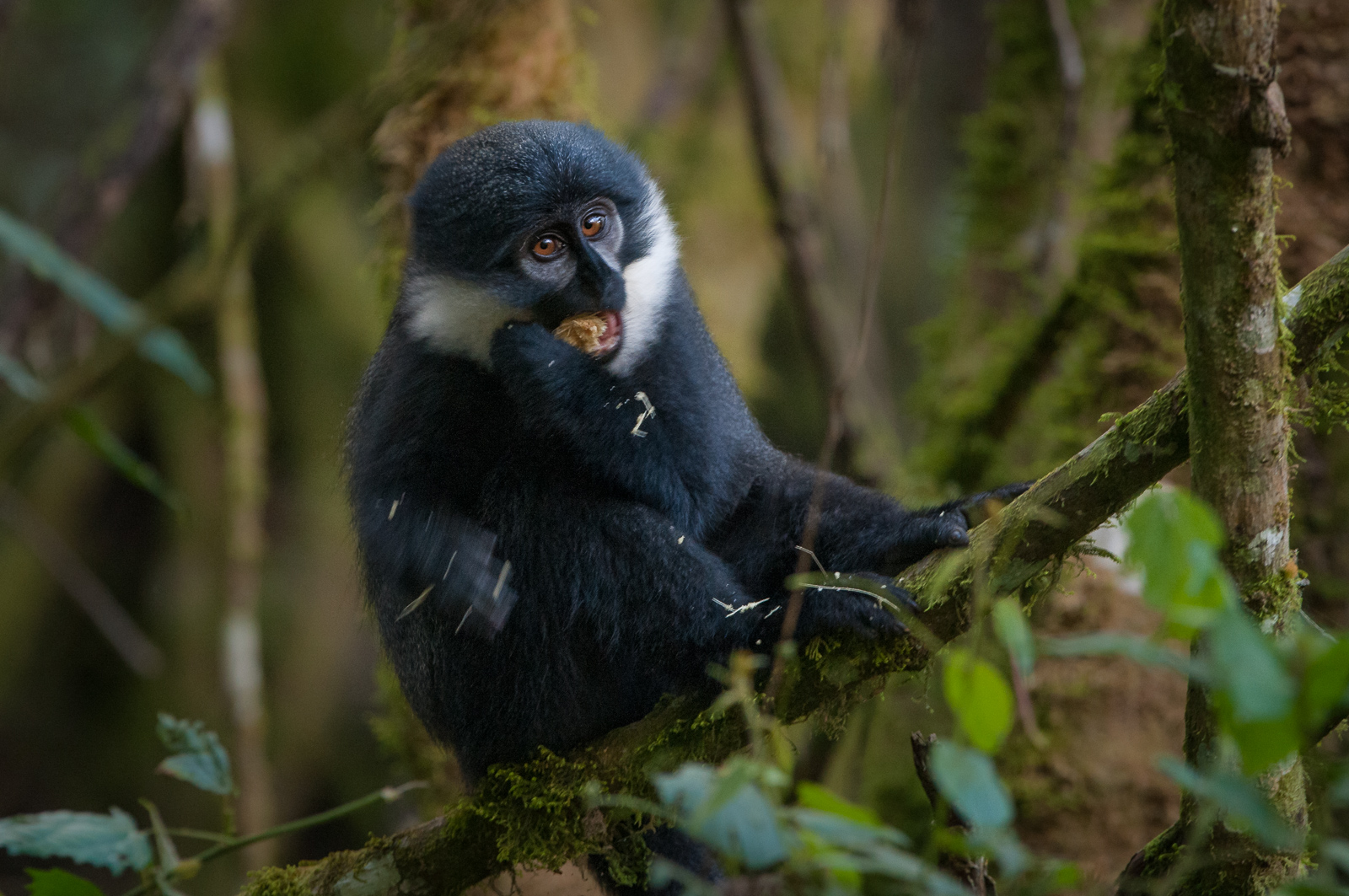 The L’Hoest’s monkey lives in the upper eastern Congo Basin of Africa in the same forested mountain regions that mountain gorillas are found. I photographed this one in Bwindi Impenetrable National Park in Uganda. Their conservation status is currently listed as vulnerable. They live in small groups dominated by females, with only a single male. They are a notoriously skittish species and will usually flee when spotted. This one appeared in front of me for only about three seconds before bounding off into the forest. Nikon D300 with Nikkor 200-400mm lens (at 340mm) ISO 800, f/5 at 1/60th of a second