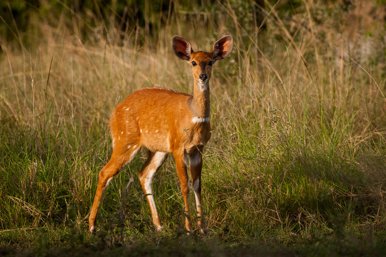 The bushbuck is a very widespread antelope throughout sub-Sahara Africa. They prefer habitat on the edge of thick forest, which provides both shelter and food. I spotted this one in Queen Elizabeth National Park in Uganda. Bushbucks are rather clumsy runners, but they are great swimmers and jumpers — being able to clear six foot obstacles with ease. Nikon D300 with Nikkor 200-400mm lens (at 360mm) ISO 400, f/5.6 at 1/640th of a second