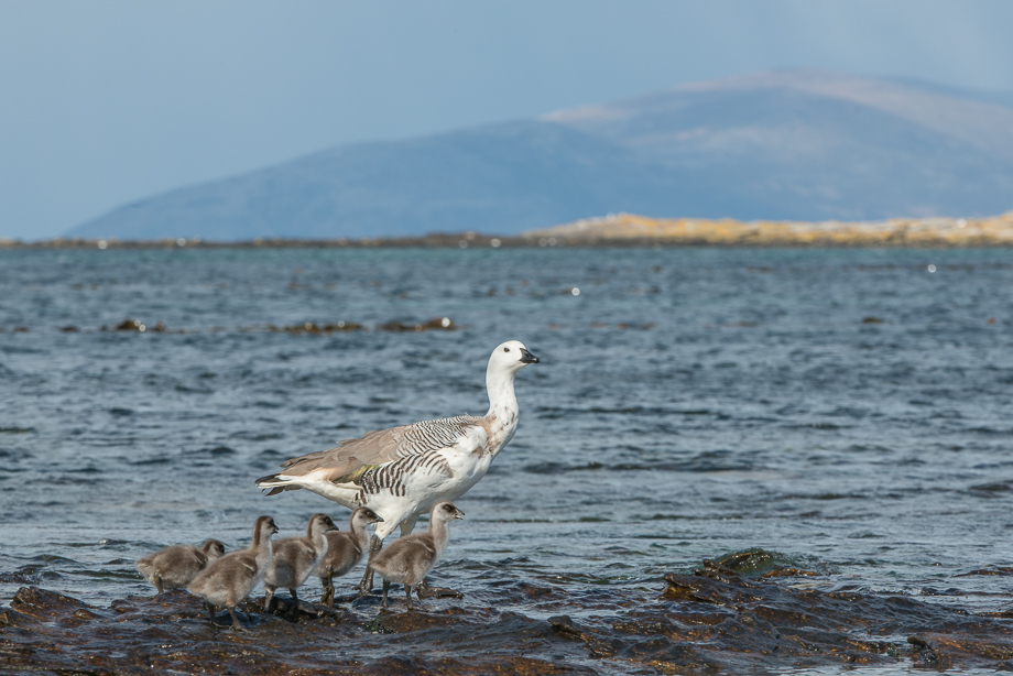 This upland goose was minding his business as he walked along the shoreline with his goslings on Carcass Island in the Falklands… Then, suddenly a kelp goose (all white) came out of nowhere and went after the goslings. Dad quickly squared off as the youngsters ran to safety with Mom (you can see the last two goslings to the right of frame)… Dad made a nice move to the right of the kelp goose… Then applied a few quick jabs to the midsection… The kelp goose was overmatched and fled the scene… Order restored, Dad joined Mom and the kids to continue on their way. Nikon D800 with Nikkor 200-400mm lens (at 300mm) ISO 400, f/14 at various shutter speeds of 1/400th of a second to 1/800th of a second