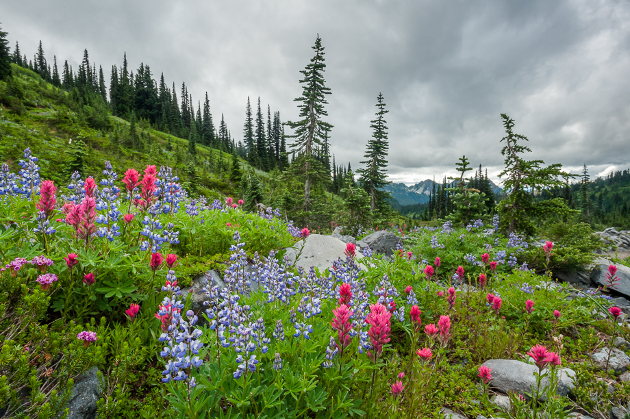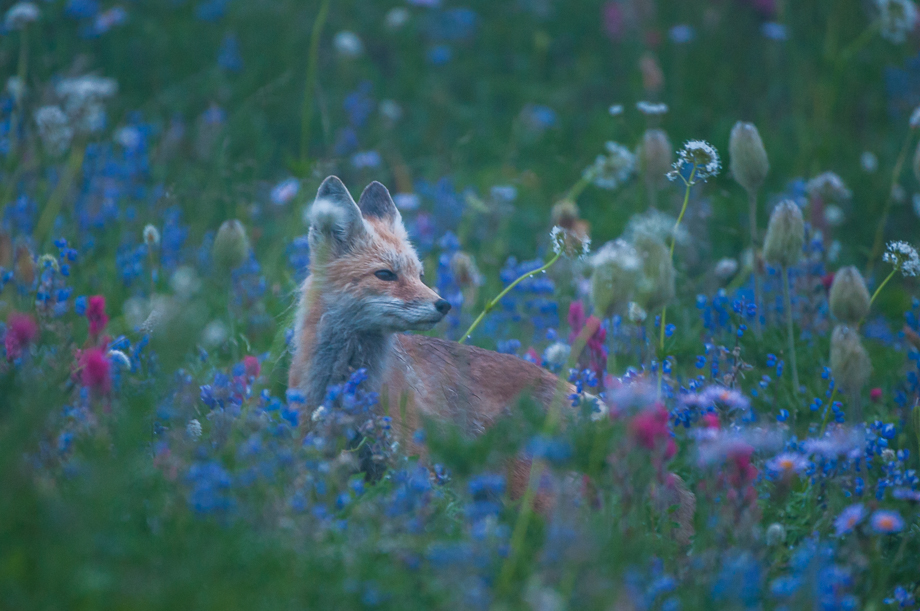 Last week I posted a landscape shot from Mount Rainier in late summer when the high alpine wildflowers were still in peak bloom. Here’s a tighter shot from that same trip of a red fox in amongst the flowers. It was getting pretty dark by the time I took this photo (well past sunset). I used a very slow shutter speed when the fox stopped moving for a few seconds. Nikon D300 with Nikkor 200-400mm lens (at 400mm) ISO 800, f/4 at 1/15th of a second
