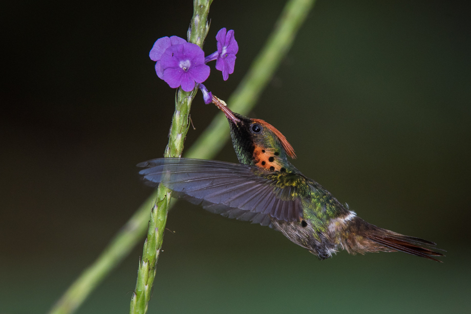 This is the tufted coquette, my new favorite bird. I figured I’d post two shots — one in flight and one perched because this tiny hummingbird seems to take on somewhat of a different appearance while doing different things. The tufted coquette is one of the smallest birds in the world at only two and a half inches. It is often mistaken for a large bee as it moves quickly from flower to flower. I took these two shots at the Asa Wright Nature Center in the northern mountains of Trinidad. Top Shot — Nikon D810 with Nikkor 200-400mm lens (at 400mm) ISO 800, f/11 at 1/250th of a second, two Nikon SB900 flash units set manually to 1/16th power