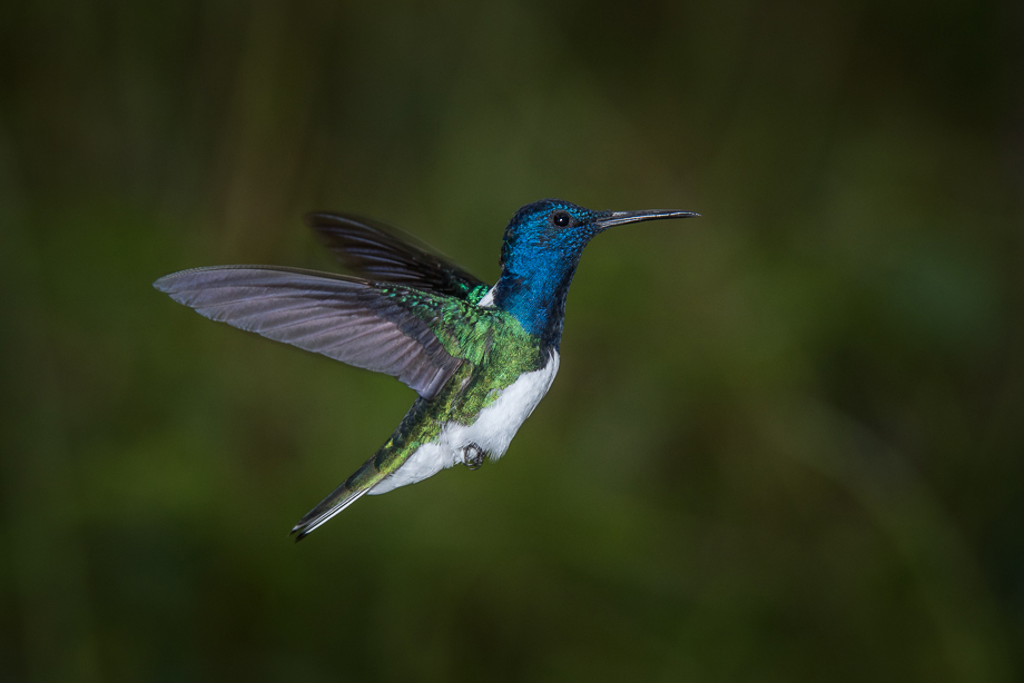 The white-necked jacobin (also known as the great jacobin or the collared hummingbird) was just one of the many beautiful hummingbirds that I saw while in Trinidad at the Asa Wright Nature Center. This is the male of the species. The females are more uniformly green. A hummingbird’s wings can flap at up to 80 times per second, so I used a reduced flash setting to help freeze the action, with only slight ghosting of the wingtips from ambient light. Nikon D810 with Nikkor 200-400mm lens (at 240mm) ISO 500, f/11 at 1/250th of a second, two Nikon SB-900 flash units at 1/16th power