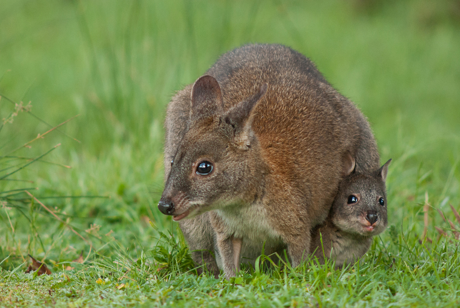 Pademelons are a very small marsupial related to both wallabies and kangaroos. Seeing one bouncing through the forest almost looks like a large rabbit. This mother and her joey emerged from the forest at the end of the day to forage on the open lawns of Lamington National Park in Queensland Australia. Nikon D200 with Nikkor 600mm manual focus lens, ISO 400, f/5.6 at 1/80th of a second