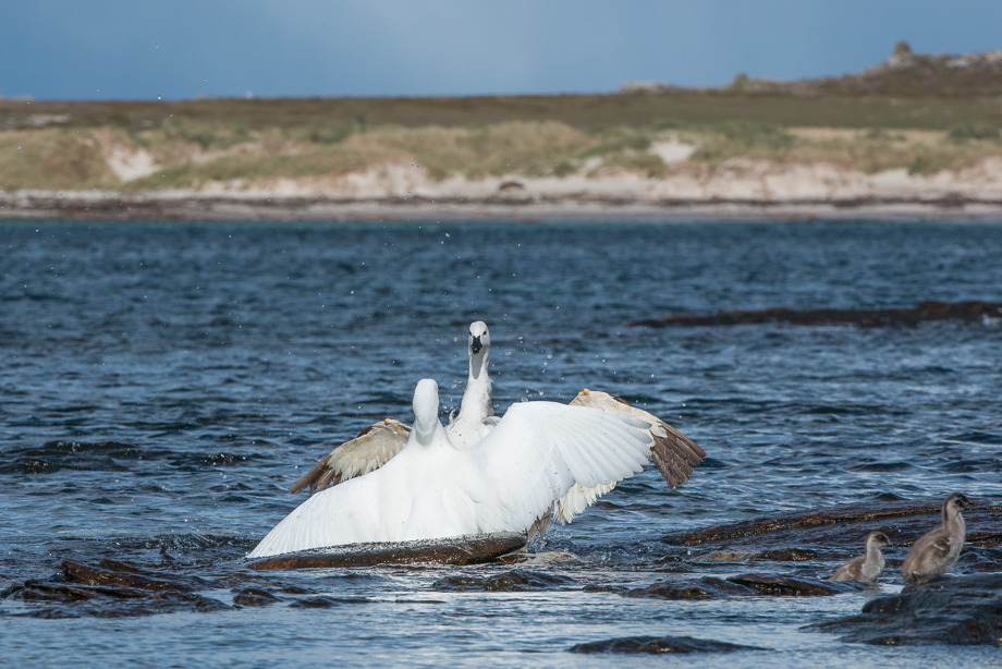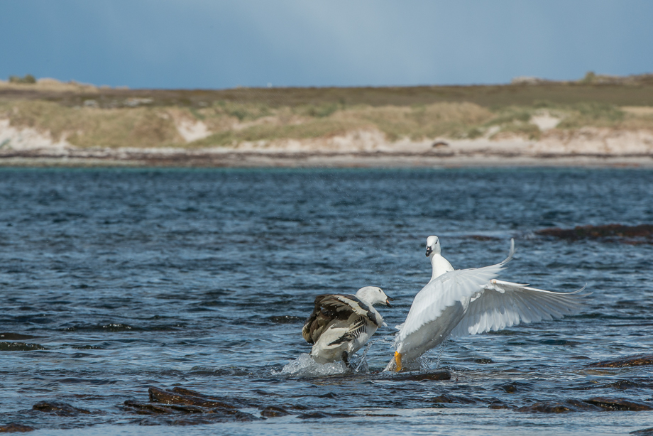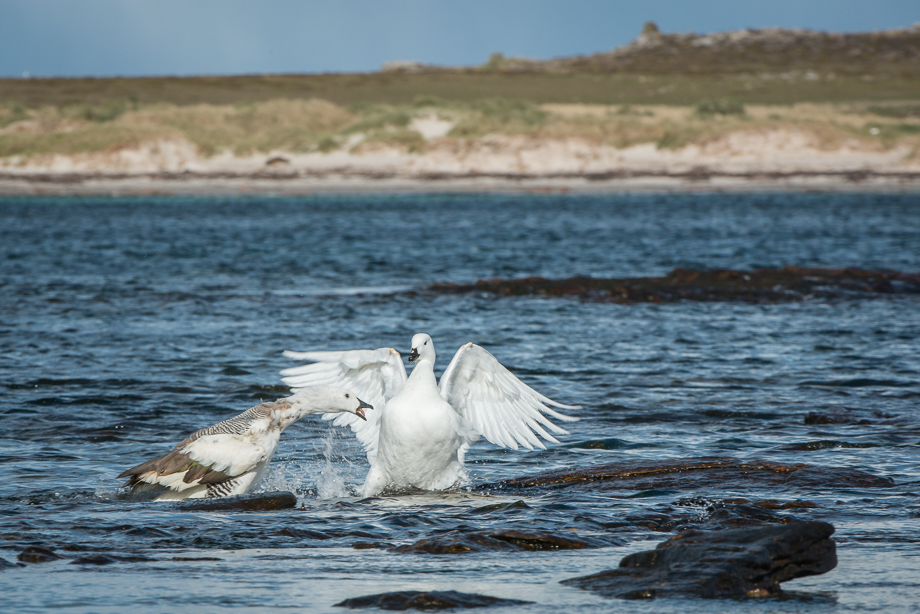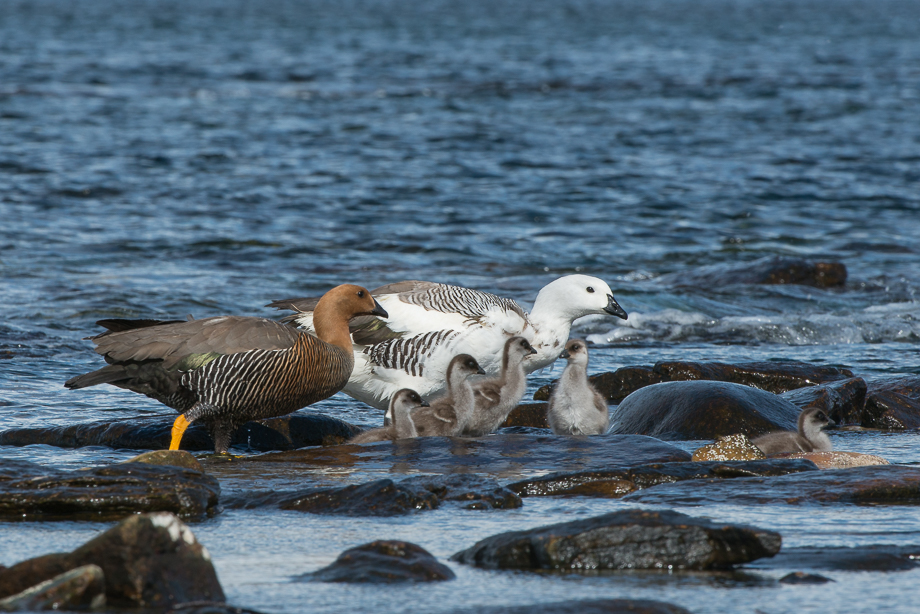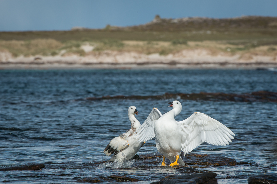 This upland goose was minding his business as he walked along the shoreline with his goslings on Carcass Island in the Falklands… Then, suddenly a kelp goose (all white) came out of nowhere and went after the goslings. Dad quickly squared off as the youngsters ran to safety with Mom (you can see the last two goslings to the right of frame)… Dad made a nice move to the right of the kelp goose… Then applied a few quick jabs to the midsection… The kelp goose was overmatched and fled the scene… Order restored, Dad joined Mom and the kids to continue on their way. Nikon D800 with Nikkor 200-400mm lens (at 300mm) ISO 400, f/14 at various shutter speeds of 1/400th of a second to 1/800th of a second